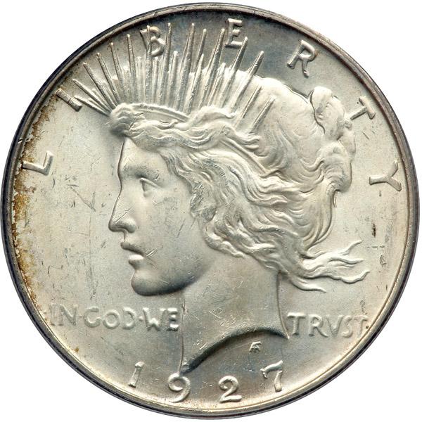 1927-D Peace Dollar. PCGS graded MS-64. Light hint of gold tone. A lovely lustrous specimen (PCGS # 7371) .