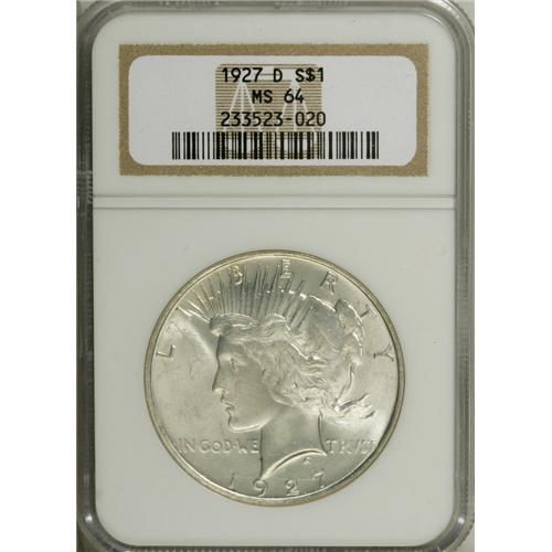 <B>1927-D S$1 MS64 NGC.</B></I> Abundant luster is the hallmark of this pleasing, untoned near-Gem. Scattered small abrasions and superficial luster grazes prevent an even finer grade.<BR><BR><b>Shipping:</b> Coins & Currency (<a target="_blank" href="http://www.heritageauctions.com/common/shipping.php">view shipping information</a>)