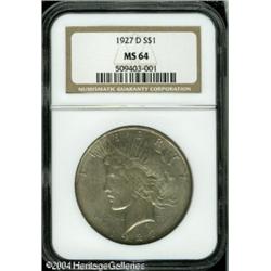 1927-D S$1 MS64 NGC. Deeply toned with thick, fros <B>1927-D S$1 MS64 NGC.</B></I> Deeply toned with thick, frosty, underlying luster. A difficult date to locate much nicer, and a very Choice example. <BR><BR><B>Important notice:</B> Heritage usually auctions material at the rate of 200-250 lots per hour. On some occasions eBay Live bid software or the Internet may not be able to keep up with the pace of the auction. We recommend placing a realistic absentee bid now as insurance to avoid disappointment. Occasionally the auctioneer may eliminate or reject an eBay Live bid, and the auctioneer may also reopen a lot after the close of the eBay live bidding (usually because we missed an audience bid), and may reject your bid even if it shows you as the winning bidder. By bidding via eBay Live, you agree that Heritage may award the lot to another bidder at its sole discretion under the circumstances described above or any other reasonable circumstances. Since eBay bids are not shown to us until we open the lot on the floor, we treat those bids just like floor bids. In most cases the floor responds before the eBay bid is presented to us, due to Internet lag time, so for consistency we have made it a policy that floor bids are always considered first over tie eBay live bids. Also please note that all Heritage lots purchased through eBay Live carry a 20% Buyer's Premium. Please make sure you read the Terms and Conditions before you bid. This lot is being auctioned in conjunction with a live floor auction by Heritage Galleries & Auctioneers. All final auction and invoice information will be supplied by Heritage Galleries & Auctioneers, and all other information should be considered preliminary. Lot:7801