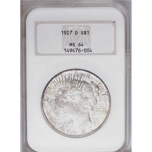 <B>1927-D S$1 MS64 NGC.</B></I> Rose, gold, and sky-gray hues enrich this sharply struck and thoroughly lustrous near-Gem. The reverse is particularly unblemished. In a former generation NGC holder.<BR><BR><b>Shipping:</b> Coins & Currency (<a target="_blank" href="http://www.heritageauctions.com/common/shipping.php">view shipping information</a>)