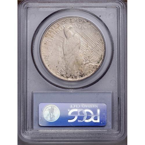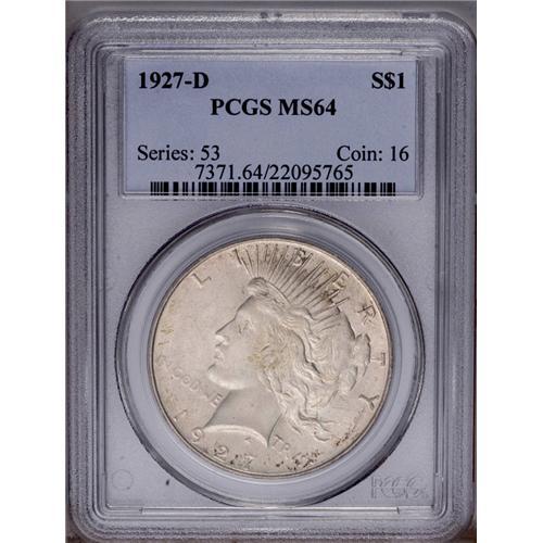 <B>1927-D<img border='0' src='http://www.heritagecoins.com/images/star.gif' width=10 height=10>$1> MS64 PCGS.</B></I> Boldly struck with creamy satin luster and lightly toned surfaces that feature speckled russet and dark-green patina near the borders. A handful of minor abrasions are found near the center of each side, limiting the grade. Very scarce any finer than this example. <BR><BR><B>Important notice:</B> Heritage usually auctions material at the rate of 200-250 lots per hour. On some occasions eBay Live bid software or the Internet may not be able to keep up with the pace of the auction. We recommend placing a realistic absentee bid now as insurance to avoid disappointment. Occasionally the auctioneer may eliminate or reject an eBay Live bid, and the auctioneer may also reopen a lot after the close of the eBay live bidding (usually because we missed an audience bid), and may reject your bid even if it shows you as the winning bidder. By bidding via eBay Live, you agree that Heritage may award the lot to another bidder at its sole discretion under the circumstances described above or any other reasonable circumstances. Since eBay bids are not shown to us until we open the lot on the floor, we treat those bids just like floor bids. In most cases the floor responds before the eBay bid is presented to us, due to Internet lag time, so for consistency we have made it a policy that floor bids are always considered first over tie eBay live bids. Also please note that all Heritage lots purchased through eBay Live carry a 20% Buyer's Premium. Please make sure you read the Terms and Conditions before you bid. This lot is being auctioned in conjunction with a live floor auction by Heritage Galleries & Auctioneers. All final auction and invoice information will be supplied by Heritage Galleries & Auctioneers, and all other information should be considered preliminary. Lot:3854 <BR><BR><B>Winning Notification and Billing:</B> After the FINAL session in this auction is complete, Heritage will send e-mail and snail mail invoices. This process normally takes several days. All final auction and invoice information will be supplied by Heritage Galleries & Auctioneers, and all other information should be considered preliminary. <BR><BR>This auction will be conducted on a live auction floor and over the Internet through eBay Live. If you choose to place an absentee bid, please take a moment to <font color='#0000ff'><u><a href='http://pages.ebay.com/liveauctions/help/before/laabsentee.html'>learn how eBay Live absentee bidding works</a></u></font><font color='#000000'>