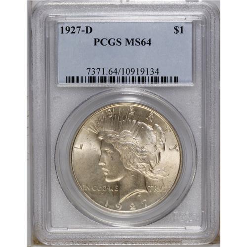 <B>1927-D S$1 MS64 PCGS.</B></I> Highly lustrous with a slightly frosty gold-gray obverse and greater brilliance on the reverse. Well struck overall with few marks for the grade.<BR><BR><b>Shipping:</b> Coin/Currency (<a target="_blank" href="http://www.heritageauctions.com/common/shipping.php">view shipping information</a>)
