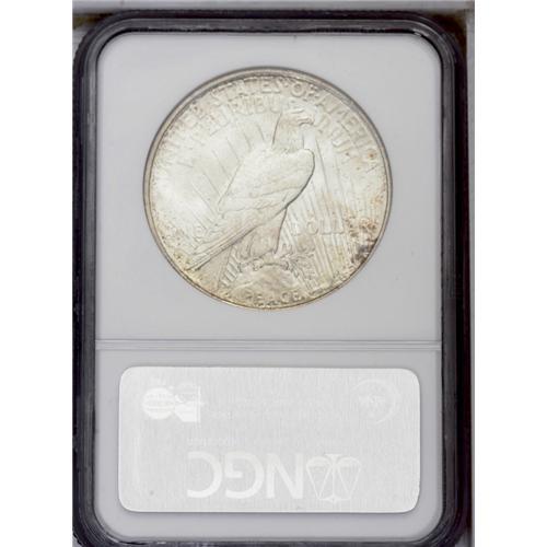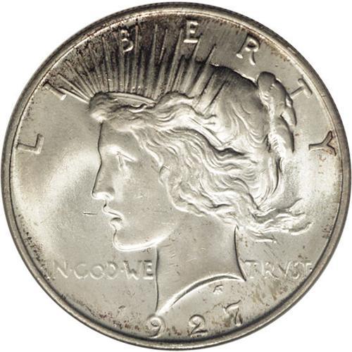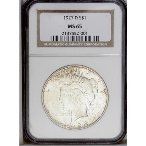 <B>1927-D<img border='0' src='http://www.heritagecoins.com/images/star.gif' width=10 height=10>$1> MS65 NGC.</B></I> A satiny Gem with pale champagne toning gradually changing to deep golden-brown at the borders. Well struck with nearly complete design details on both sides, within the context of the Peace dollar issue. Not only is this an aesthetically pleasing Gem, but it is approaching the finest available quality for the date. Census: 75 in 65, 4 finer (2/06).