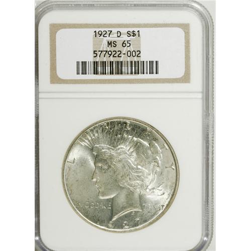 <B>1927-D S$1 MS65 NGC.</B></I> This lightly toned Gem has vivacious luster and pleasing eye appeal. Well struck aside from the ST in TRVST. The obverse is particularly unabraded. A quality example of this lower mintage issue. As of (3/07), NGC and PCGS combined have certified a mere 13 pieces finer.<BR><BR><b>Shipping:</b> Coins & Currency (<a target="_blank" href="http://www.heritageauctions.com/common/shipping.php">view shipping information</a>)