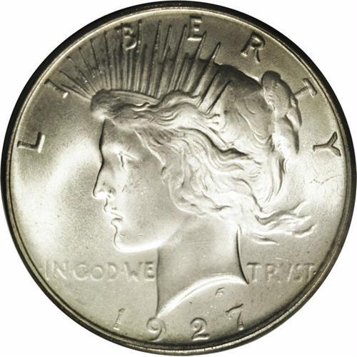 <B>1927-D<img border='0' src='http://www.heritagecoins.com/images/star.gif' width=10 height=10>$1> MS65 PCGS.</B></I> Among the two and a half bags of this issue that were sold at public auction in 1992, only 50 or so pieces qualified as MS65, the vast majority were in the MS60-63 grade range. This is an amazingly clean coin. There really are no mentionable or even noticeable abrasions on either side of this exceptional, upper-end Gem. Fully struck, as one would expect, the surfaces have rich, satiny mint luster and are overlaid with a light haze of oyster-gray patina. This is a 1927-D worth stretching for.
