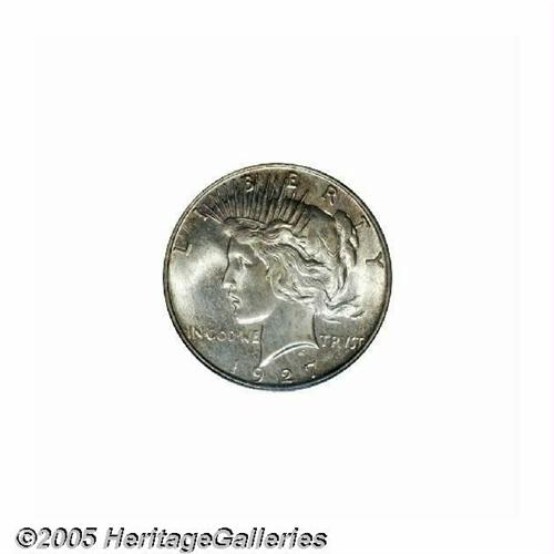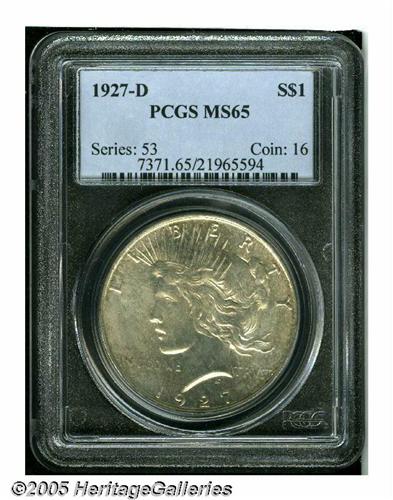 <B>1927-D<S$1> MS65 PCGS.</B></I> Even though two and a half bags of this issue entered the market ten years ago, it has not had any significant impact on the availability of Gems. This piece has full definition on Liberty's hair, and the reverse is just a bit less well brought up. There are no obvious abrasions on either side, and both obverse and reverse are covered with a light speckling of golden-russet patina. Population: 94 in 65, 7 finer (6/05).