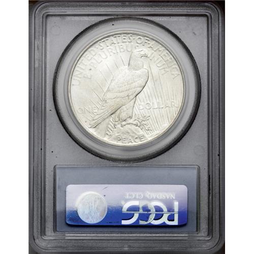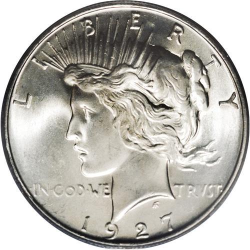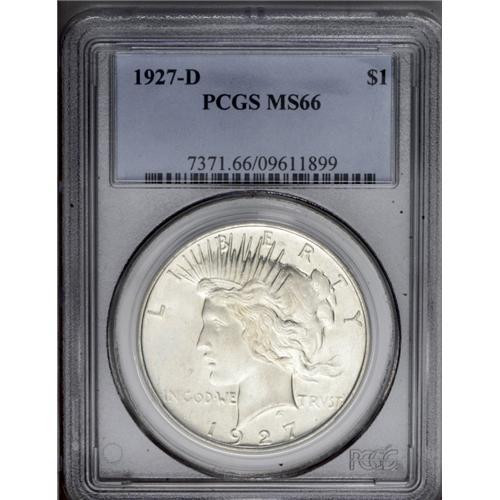 <B>1927-D<img border='0' src='http://www.heritagecoins.com/images/star.gif' width=10 height=10>$1> MS66 PCGS.</B></I> An exceptionally clean and well struck example of this important semi-key issue. The surfaces are untoned and virtually free from abrasions. In fact, one would be hard pressed to identify a single distracting abrasion, and those that are present are quite small. The '27-D has proven to be very elusive in strict Gem condition, in spite of an original bag that was sold at auction several years ago.<BR><I>From The Robert Moreno Registry Collection of Peace Dollars.</B></I>
