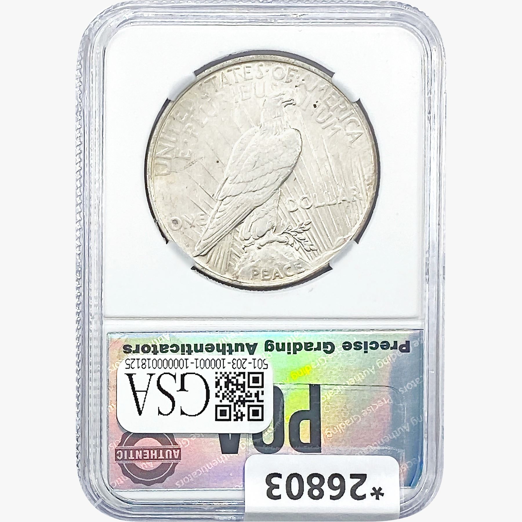 COINS AND CURRENCY LISTED IN GSA’S CATALOG AS GRADED AND ENCAPSULATED BY PCGS, NGC, ANACS, ICG, PCGS CURRENCY, PMG, PCGS BANKNOTE GRADING, CMC OR ANY OTHER THIRD-PARTY GRADING SERVICE ARE LIKEWISE SOLD “AS-IS” EXCEPT AS EXPRESSLY SET FORTH HEREIN. ALL THIRD-PARTY GRADING SERVICE GUARANTEES, INCLUDING AUTHENTICITY, ARE THE SOLE RESPONSIBILITY OF THE THIRD-PARTY GRADING SERVICE AND NOT WARRANTIES OR GUARANTEES OF GSA. BIDDERS SHOULD CONTACT THESE THIRD-PARTY GRADING SERVICES DIRECTLY WITH RESPECT TO ANY CLAIMS OR QUESTIONS THEY MAY HAVE CONCERNING THEIR GUARANTEES AND WARRANTIES. BIDDERS ACKNOWLEDGE AND AGREE THAT AUCTIONEER IS NOT BOUND BY OR LIABLE FOR ANY OPINION OR CERTIFICATION BY ANY THIRD-PARTY GRADING SERVICE. REMOVAL OF A PRODUCT FROM ITS PROTECTIVE CASING OR HOLDER OR ALTERATION OF ANY COIN HOLDER WAIVES ALL RIGHTS CONCERNING THE PRODUCT CONTAINED THEREIN.