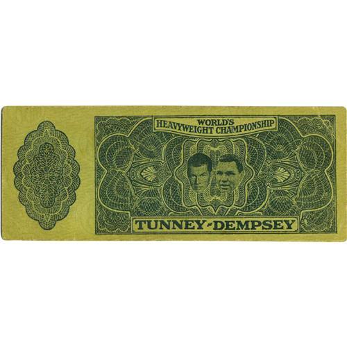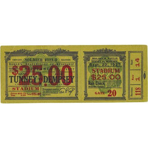 <B>1927 Jack Dempsey vs. Gene Tunney "Long Count" Bout Full Ticket.</B></I> Jack Dempsey fought Gene Tunney for the second time on September 22, 1927 at Soldier Field in Chicago. Tunney out pointed Dempsey until the seventh round when Dempsey landed a volley of punches sending Tunney crashing to the canvas. Dempsey failed to go immediately to a neutral corner and referee Dave Barry delayed the count. But instead of picking up the count with the timekeeper, Barry started the count at one, giving Tunney several extra seconds to regain his feet. The very next round Tunney dropped Dempsey with a chopping right and Barry immediately started the count, without sending Tunney to a neutral corner! Thus was born the celebrated "long count" fight that has remained a controversy to this day. Presented here is an extremely rare full, official ticket to this event that includes section, row and seat numbers. The ticket measures 2.75x6.75" and is in excellent condition with a clean front and back. Both fighters are ornately pictured and the stub is still firmly attached. This ticket is an extremely rare first row ticket. These ringside tickets were printed using four different types of ink and the illustrations on the back have an embossed feel, which is different from the standard ticket issued. One of the best examples we've seen. <BR><BR><B>Important notice:</B> Heritage usually auctions material at the rate of 200-250 lots per hour. On some occasions eBay Live bid software or the Internet may not be able to keep up with the pace of the auction. We recommend placing a realistic absentee bid now as insurance to avoid disappointment. Occasionally the auctioneer may eliminate or reject an eBay Live bid, and the auctioneer may also reopen a lot after the close of the eBay live bidding (usually because we missed an audience bid), and may reject your bid even if it shows you as the winning bidder. By bidding via eBay Live, you agree that Heritage may award the lot to another bidder at its sole discretion under the circumstances described above or any other reasonable circumstances. Since eBay bids are not shown to us until we open the lot on the floor, we treat those bids just like floor bids. In most cases the floor responds before the eBay bid is presented to us, due to Internet lag time, so for consistency we have made it a policy that floor bids are always considered first over tie eBay live bids. Also please note that all Heritage lots purchased through eBay Live carry a 22.5% Buyer's Premium. Please make sure you read the Terms and Conditions before you bid. This lot is being auctioned in conjunction with a live floor auction by Heritage Galleries & Auctioneers. All final auction and invoice information will be supplied by Heritage Galleries & Auctioneers, and all other information should be considered preliminary. Lot:19149 <BR><BR><B>Winning Notification and Billing:</B> After the FINAL session in this auction is complete, Heritage will send e-mail and snail mail invoices. This process normally takes several days. All final auction and invoice information will be supplied by Heritage Galleries & Auctioneers, and all other information should be considered preliminary. <BR><BR>This auction will be conducted on a live auction floor and over the Internet through eBay Live. If you choose to place an absentee bid, please take a moment to <font color='#0000ff'><u><a href='http://pages.ebay.com/liveauctions/help/before/laabsentee.html'>learn how eBay Live absentee bidding works</a></u></font><font color='#000000'>