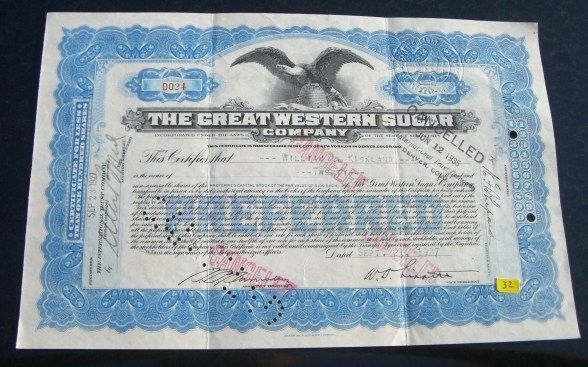 1927 *EXTREMELY RARE* 20 SHARES BLUE STOCK CERTIFICATE *THE GREAT WESTERN SUGAR COMPANY - NICE STOCK CERTIFICATE*!! ***Coin, Currency & All Items Listed in this auction - Grades, Conditions and Values are not Safe Deposit Coins LLC Responsibilty. Grades, Condition and Values are determined by Consigner(s) & Buyers ONLY