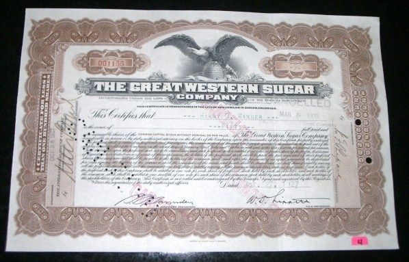 1927 EXTREMELY RARE 50 SHARES STOCK CERTIFICATE *THE GREAT WESTERN SUGAR COMPANY - NICE STOCK CERTIFICATE*!! ***Coin, Currency & All Items Listed in this auction - Grades, Conditions and Values are not Safe Deposit Coins LLC Responsibilty. Grades, Condition and Values are determined by Consigner(s) & Buyers ONLY