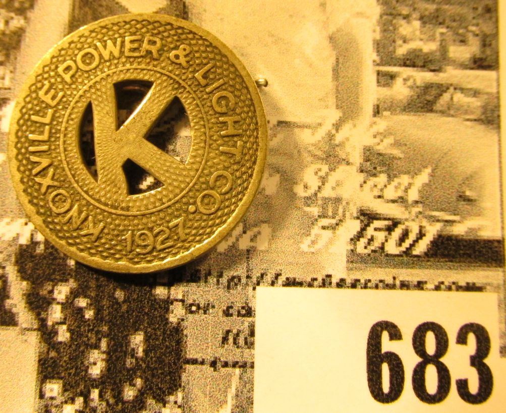 "1927/Knoxville Power & Light Co.", "Good For/One Fair", (Iowa Transportation Token).