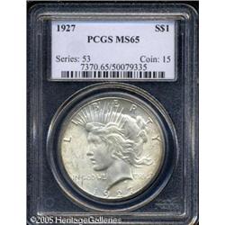 <B>1927<img border='0' src='http://www.heritagecoins.com/images/star.gif' width=10 height=10>$1 MS65 PCGS.</B></I> An unusually sharp strike seems to separate this Gem from the run-of-the-mill example. Pleasing original toning is seen in slight amounts near the obverse peripheries, and the carefully preserved surfaces only show a few minor blemishes. A very attractive, high grade example of this popular and scarce semi-key date. Population: 161 in 65, 5 finer (1/05). Lot:10719