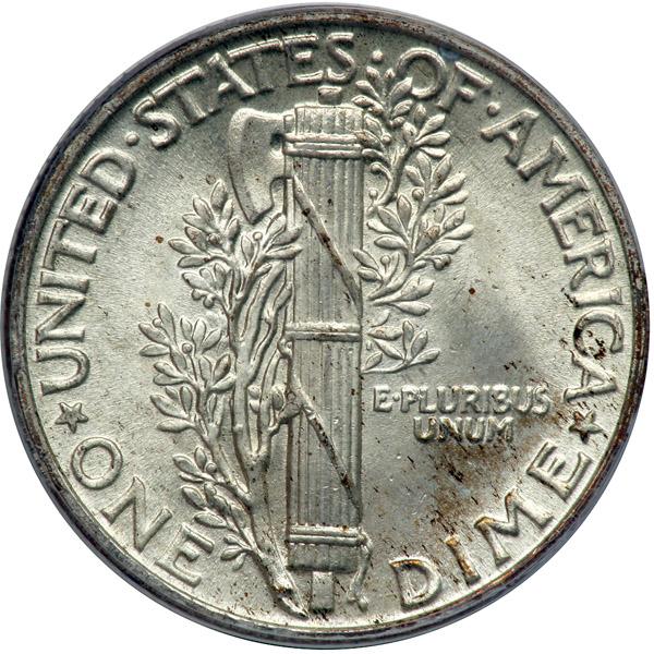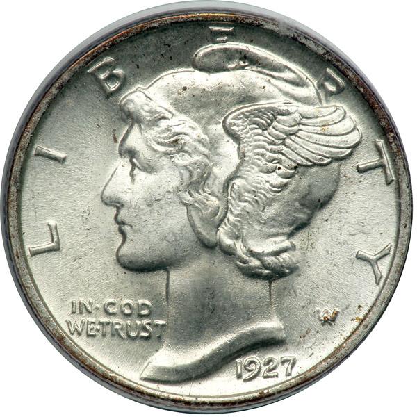 1927 Mercury Dime. PCGS graded MS-66 Full Bands. Housed in an Old Green Holder. Well struck and mostly untoned. Not as common in this outstanding state of preservation as it's mintage might indicate. Pop 109; 20 finer, 2 in 66+FB, 18 in 67FB (PCGS # 4961) .