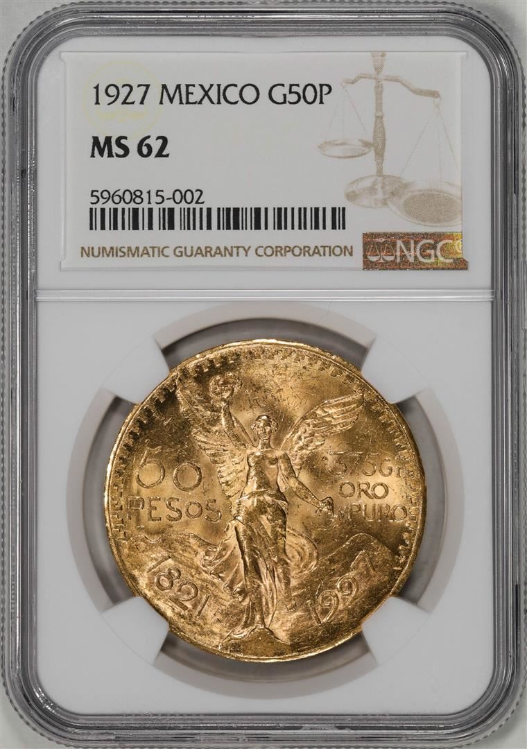 One 1927 Mexico 50 Pesos Gold Coin NGC MS62. NGC Certified.