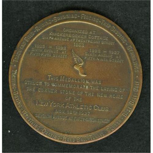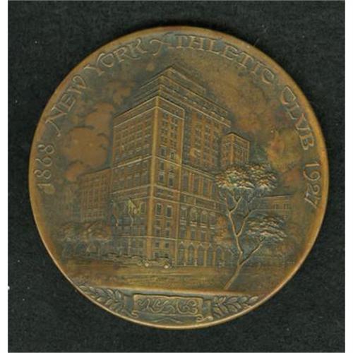 <B>1927 New York Athletic Club Medal.</B></I> Bronze, 82.3 mm, 209.2 gm. Whitehead-Hoag is the maker. Struck to commemorate the corner stone ceremony of Nov. 16, 1927. A maroon medal with traces of gray verdigris and minor edge marks.<BR><BR><b>Shipping:</b> Coins & Currency (<a target="_blank" href="http://www.heritageauctions.com/common/shipping.php">view shipping information</a>)