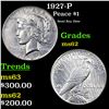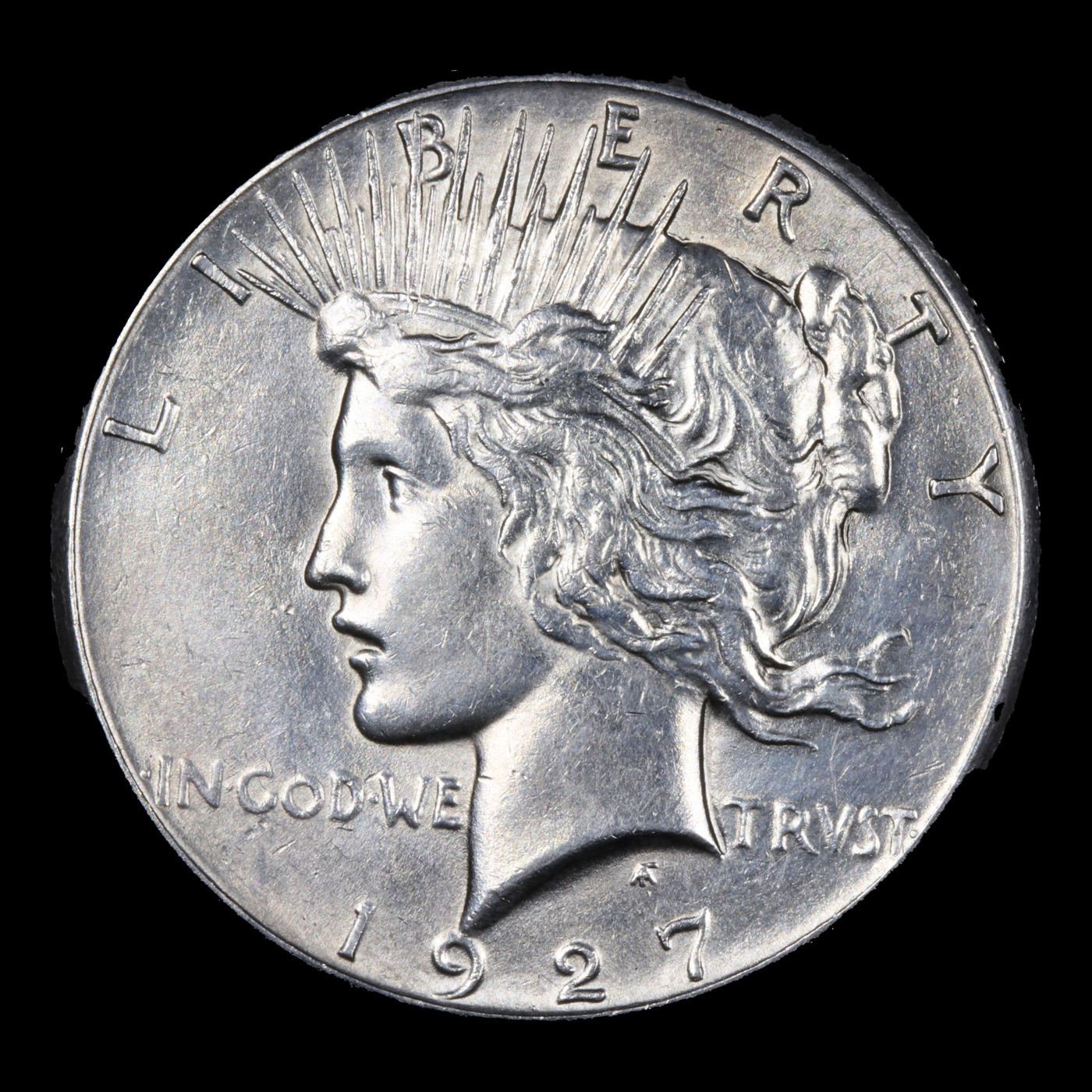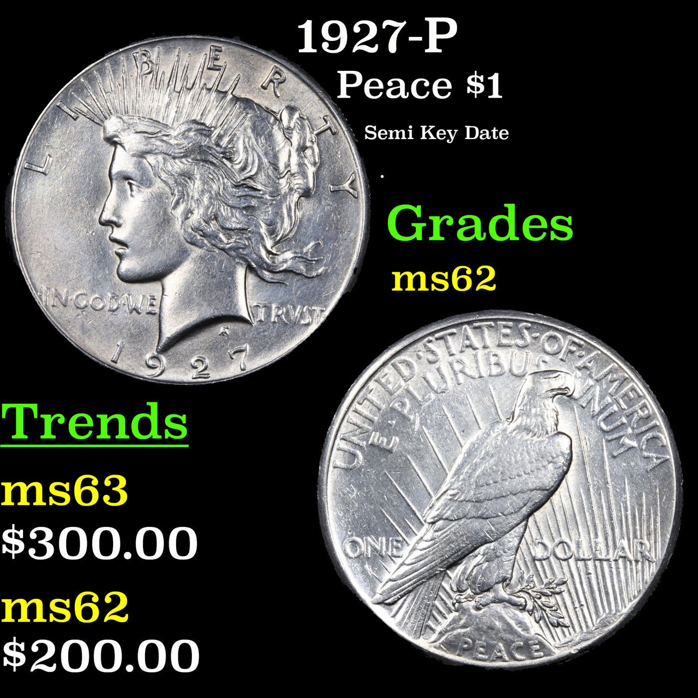 1927-P Peace Dollar $1 Grades Select Unc. The 27-p is the big sleeper of numismatics in my opinion. It has the 2nd lowest mintage in the whole Peace dollar series. Lower than the 34-s, the 21-p, yet it does not command its proper value. Good coin to own multiple of and save, in my opinion, but if you've been coming to our auctions for a while you will have seen that this has always been my opinion.