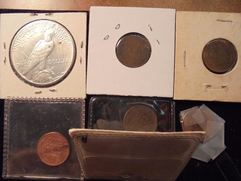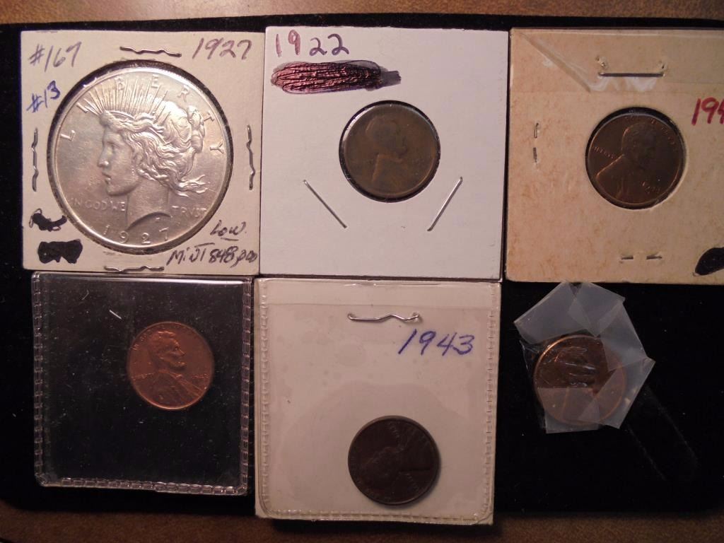1927 PEACE SILVER DOLLAR & 5 LINCOLN CENTS 1922 WEAK "D", 2-1943 COPPER PLATED LINCOLN CENTS, 1944 &