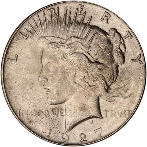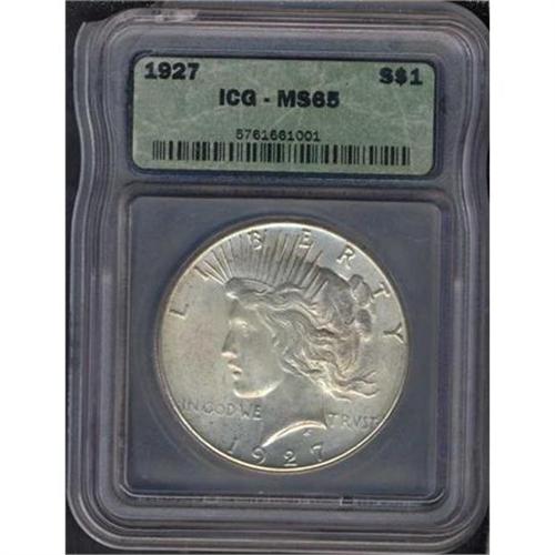 <b>1927 Peace Dollar. ICG graded MS65.</b> Without doubt the most visually arresting feature of this coin is its soft, frosted mint luster under natural toning. There are a few fingerprint-caused flyspecks around the date that place the coin at the bottom end of its grade. Yet clear-cut devices point to it having been giving the proper strike by the dies <b>(PCGS # 7370)</b>