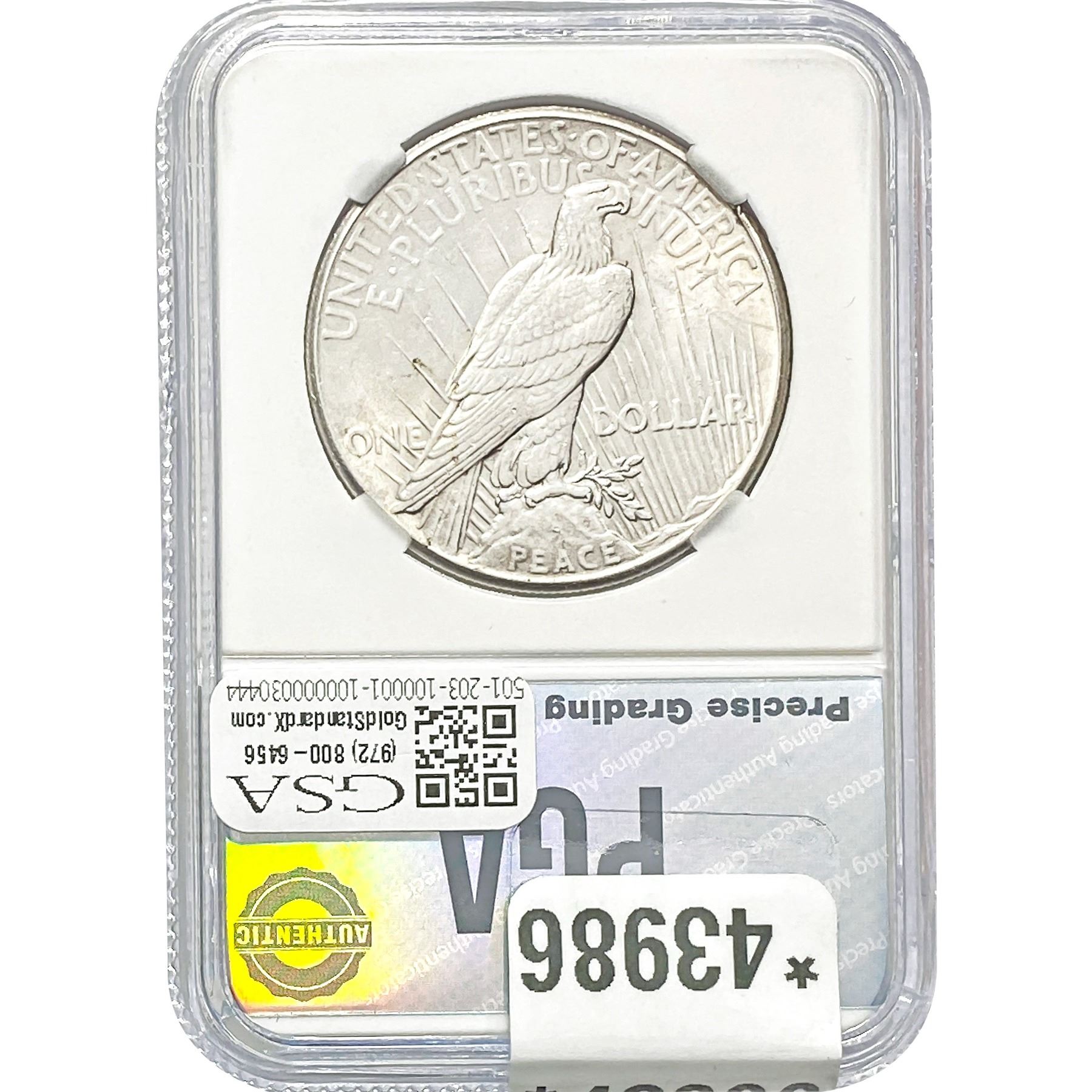 COINS AND CURRENCY LISTED IN GSA’S CATALOG AS GRADED AND ENCAPSULATED BY PCGS, NGC, ANACS, ICG, PCGS CURRENCY, PMG, PCGS BANKNOTE GRADING, CMC OR ANY OTHER THIRD-PARTY GRADING SERVICE ARE LIKEWISE SOLD “AS-IS” EXCEPT AS EXPRESSLY SET FORTH HEREIN. ALL THIRD-PARTY GRADING SERVICE GUARANTEES, INCLUDING AUTHENTICITY, ARE THE SOLE RESPONSIBILITY OF THE THIRD-PARTY GRADING SERVICE AND NOT WARRANTIES OR GUARANTEES OF GSA. BIDDERS SHOULD CONTACT THESE THIRD-PARTY GRADING SERVICES DIRECTLY WITH RESPECT TO ANY CLAIMS OR QUESTIONS THEY MAY HAVE CONCERNING THEIR GUARANTEES AND WARRANTIES. BIDDERS ACKNOWLEDGE AND AGREE THAT AUCTIONEER IS NOT BOUND BY OR LIABLE FOR ANY OPINION OR CERTIFICATION BY ANY THIRD-PARTY GRADING SERVICE. REMOVAL OF A PRODUCT FROM ITS PROTECTIVE CASING OR HOLDER OR ALTERATION OF ANY COIN HOLDER WAIVES ALL RIGHTS CONCERNING THE PRODUCT CONTAINED THEREIN.