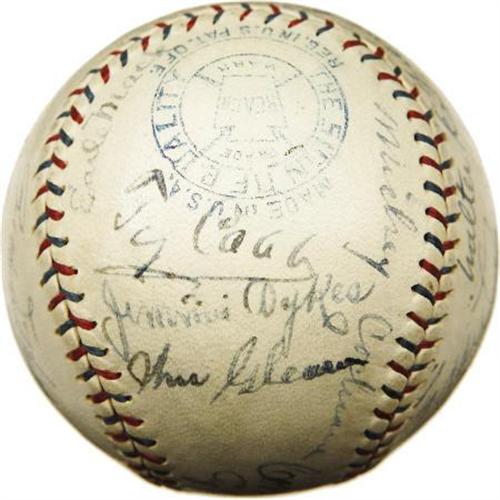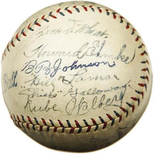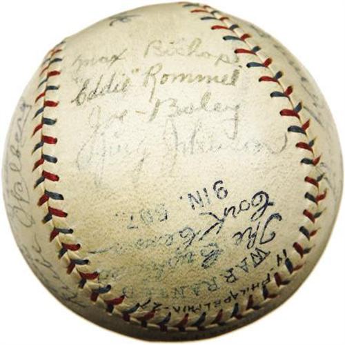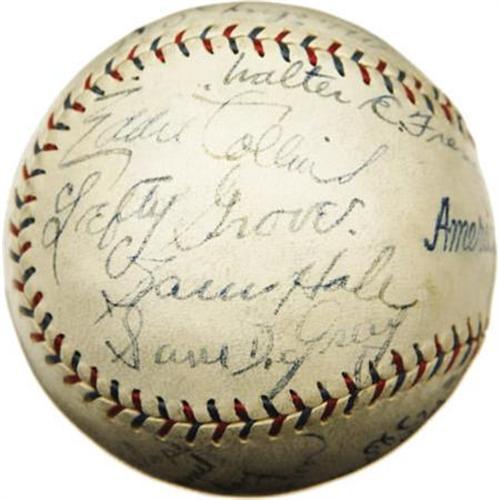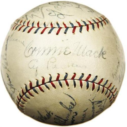 <B>1927 Philadelphia Athletics Team Signed Baseball.</B></I> After competition from the rogue Federal League forced Connie Mack to dismantle what may have been the finest compilation of baseball talent ever to inhabit a single dugout in the mid-Teens, the Tall Tactician was steadily building toward his second great masterpiece that would eclipse even the Yankees of Ruth and Gehrig in the coming seasons. This OAL (Johnson) sphere may be even more desirable to collectors than the World Championship models to come, as it features a selection of iconic veterans who helped pave the way but retired before the glory days arrived. Marvelous offerings from Ty Cobb, Eddie Collins and Zack Wheat are counted among the twenty-one 7/10 and better black ink offerings, joined by the likes of Cochrane, Mack, Grove, Gleason, Dykes, Hale, Perkins, Boley and Rommel. <I>LOA from PSA/DNA. LOA from James Spence Authentication.</B></I><BR><BR><b>Shipping:</b> Balls, Pucks, etc., Small (<a target="_blank" href="http://www.heritageauctions.com/common/shipping.php">view shipping information</a>)