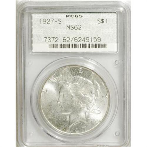 <B>1927-S $1 MS62 PCGS.</B></I> PCGS Population (773/2675). NGC Census: (425/1800). Mintage: 866,000. Numismedia Wsl. Price for NGC/PCGS coin in MS62: $175. (#7372)<BR><BR><B>Coin Engraver:</B> Anthony de Francisci<BR><BR><b>Shipping:</b> Coins & Currency (<a target="_blank" href="http://www.heritageauctions.com/common/shipping.php">view shipping information</a>)