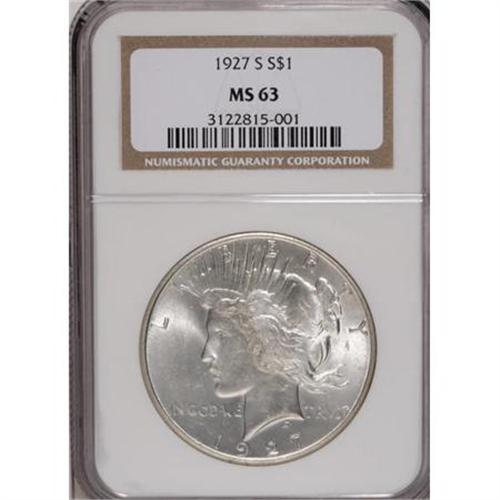 <B>1927-S $1 MS63 NGC.</B></I> NGC Census: (851/973). PCGS Population (1494/1239). Mintage: 866,000. Numismedia Wsl. Price for NGC/PCGS coin in MS63: $400. (#7372)<BR><BR><B>Coin Engraver:</B> Anthony de Francisci<BR><BR><b>Shipping:</b> Coins & Currency (<a target="_blank" href="http://www.heritageauctions.com/common/shipping.php">view shipping information</a>)