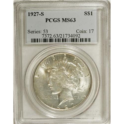 <B>1927-S $1 MS63 PCGS.</B></I> PCGS Population (1405/1034). NGC Census: (799/852). Mintage: 866,000. Numismedia Wsl. Price: $380. (#7372)<BR><BR><b>Shipping:</b> Coins & Currency (<a target="_blank" href="http://www.heritageauctions.com/common/shipping.php">view shipping information</a>)
