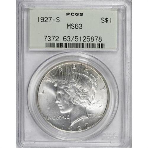 <B>1927-S $1 MS63 PCGS.</B></I> PCGS Population (1449/1140). NGC Census: (829/937). Mintage: 866,000. Numismedia Wsl. Price for NGC/PCGS coin in MS63: $380. (#7372)<BR><BR><B>Coin Engraver:</B> Anthony de Francisci<BR><BR><b>Shipping:</b> Coins & Currency (<a target="_blank" href="http://www.heritageauctions.com/common/shipping.php">view shipping information</a>)
