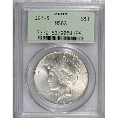 <B>1927-S $1 MS63 PCGS.</B></I> PCGS Population (1462/1186). NGC Census: (843/931). Mintage: 866,000. Numismedia Wsl. Price for NGC/PCGS coin in MS63: $380. (#7372)<BR><BR><B>Coin Engraver:</B> Anthony de Francisci<BR><BR><b>Shipping:</b> Coins & Currency (<a target="_blank" href="http://www.heritageauctions.com/common/shipping.php">view shipping information</a>)