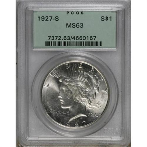 <B>1927-S $1 MS63 PCGS.</B></I> PCGS Population (1493/1236). NGC Census: (851/963). Mintage: 866,000. Numismedia Wsl. Price for NGC/PCGS coin in MS63: $400. (#7372)<BR><BR><B>Coin Engraver:</B> Anthony de Francisci<BR><BR><b>Shipping:</b> Coins & Currency (<a target="_blank" href="http://www.heritageauctions.com/common/shipping.php">view shipping information</a>)