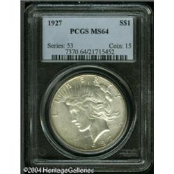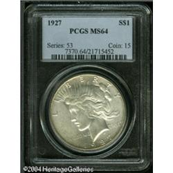 1927 S$1 MS64 PCGS. Typically struck and fully lus <B>1927 S$1 MS64 PCGS.</B></I> Typically struck and fully lustrous, with a couple of noticeable pinscratches and small contact marks on each side. The obverse is silver-gray, while a pleasing mint-green color blankets the reverse. <BR><BR><B>Important notice:</B> Heritage usually auctions material at the rate of 200-250 lots per hour. On some occasions eBay Live bid software or the Internet may not be able to keep up with the pace of the auction. We recommend placing a realistic absentee bid now as insurance to avoid disappointment. Occasionally the auctioneer may eliminate or reject an eBay Live bid, and the auctioneer may also reopen a lot after the close of the eBay live bidding (usually because we missed an audience bid), and may reject your bid even if it shows you as the winning bidder. By bidding via eBay Live, you agree that Heritage may award the lot to another bidder at its sole discretion under the circumstances described above or any other reasonable circumstances. Since eBay bids are not shown to us until we open the lot on the floor, we treat those bids just like floor bids. In most cases the floor responds before the eBay bid is presented to us, due to Internet lag time, so for consistency we have made it a policy that floor bids are always considered first over tie eBay live bids. Also please note that all Heritage lots purchased through eBay Live carry a 20% Buyer's Premium. Please make sure you read the Terms and Conditions before you bid. This lot is being auctioned in conjunction with a live floor auction by Heritage Galleries & Auctioneers. All final auction and invoice information will be supplied by Heritage Galleries & Auctioneers, and all other information should be considered preliminary. Lot:7799