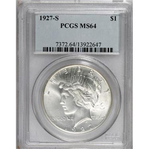 <B>1927-S $1 MS64 PCGS.</B></I> VAM-3. A Top 50 Variety. Light die doubling is present on the leaves and berries of the branch. A brilliant and well preserved near-Gem with excellent appeal for the grade.<BR><BR><B>Coin Engraver:</B> Anthony de Francisci<BR><BR><b>Shipping:</b> Coins & Currency (<a target="_blank" href="http://www.heritageauctions.com/common/shipping.php">view shipping information</a>)