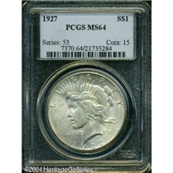1927 S$1 MS64 PCGS. Well struck and minimally mark <B>1927 S$1 MS64 PCGS.</B></I> Well struck and minimally marked, this near-Gem has appealing greenish-gray color and fulsome satiny luster over both obverse and reverse. Very close to Gem quality. A nice, high-grade example of this scarce and popular semi-key date. <BR><BR><B>Important notice:</B> Heritage usually auctions material at the rate of 200-250 lots per hour. On some occasions eBay Live bid software or the Internet may not be able to keep up with the pace of the auction. We recommend placing a realistic absentee bid now as insurance to avoid disappointment. Occasionally the auctioneer may eliminate or reject an eBay Live bid, and the auctioneer may also reopen a lot after the close of the eBay live bidding (usually because we missed an audience bid), and may reject your bid even if it shows you as the winning bidder. By bidding via eBay Live, you agree that Heritage may award the lot to another bidder at its sole discretion under the circumstances described above or any other reasonable circumstances. Since eBay bids are not shown to us until we open the lot on the floor, we treat those bids just like floor bids. In most cases the floor responds before the eBay bid is presented to us, due to Internet lag time, so for consistency we have made it a policy that floor bids are always considered first over tie eBay live bids. Also please note that all Heritage lots purchased through eBay Live carry a 20% Buyer's Premium. Please make sure you read the Terms and Conditions before you bid. This lot is being auctioned in conjunction with a live floor auction by Heritage Galleries & Auctioneers. All final auction and invoice information will be supplied by Heritage Galleries & Auctioneers, and all other information should be considered preliminary. Lot:7798