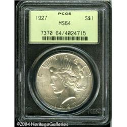 1927 S$1 MS64 PCGS. Well struck, with speckles of <B>1927 S$1 MS64 PCGS.</B></I> Well struck, with speckles of gray color over lustrous surfaces. A couple of trivial marks are noted on Liberty's chin and neck, and on the eagle. <BR><BR><B>Important notice:</B> Heritage usually auctions material at the rate of 200-250 lots per hour. On some occasions eBay Live bid software or the Internet may not be able to keep up with the pace of the auction. We recommend placing a realistic absentee bid now as insurance to avoid disappointment. Occasionally the auctioneer may eliminate or reject an eBay Live bid, and the auctioneer may also reopen a lot after the close of the eBay live bidding (usually because we missed an audience bid), and may reject your bid even if it shows you as the winning bidder. By bidding via eBay Live, you agree that Heritage may award the lot to another bidder at its sole discretion under the circumstances described above or any other reasonable circumstances. Since eBay bids are not shown to us until we open the lot on the floor, we treat those bids just like floor bids. In most cases the floor responds before the eBay bid is presented to us, due to Internet lag time, so for consistency we have made it a policy that floor bids are always considered first over tie eBay live bids. Also please note that all Heritage lots purchased through eBay Live carry a 20% Buyer's Premium. Please make sure you read the Terms and Conditions before you bid. This lot is being auctioned in conjunction with a live floor auction by Heritage Galleries & Auctioneers. All final auction and invoice information will be supplied by Heritage Galleries & Auctioneers, and all other information should be considered preliminary. Lot:7800