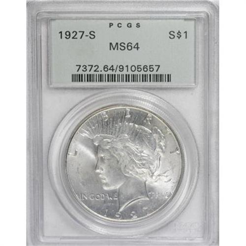 <B>1927-S $1 MS64 PCGS.</B></I> Solidly struck with attractive luster. At first glance, the surfaces appear untoned, though closer inspection reveals thin, milky patina in the fields on each side. One of just 866,000 pieces coined. In a green label holder.<BR><BR><b>Shipping:</b> Coins & Currency (<a target="_blank" href="http://www.heritageauctions.com/common/shipping.php">view shipping information</a>)