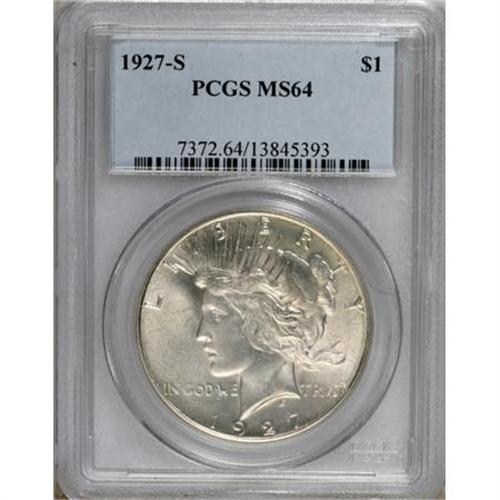 <B>1927-S $1 MS64 PCGS.</B></I> Boldly struck with just a bit of the usual softness noted over the centers. The silver-gray surfaces are illuminated by fulsome luster. A handful of small marks and a couple of shallow luster grazes preclude the Gem grade assessment. An appealing example of this scarce semi-key date, rare any finer. <BR><BR><B>Coin Engraver:</B> Anthony de Francisci<BR><BR><b>Shipping:</b> Coins & Currency (<a target="_blank" href="http://www.heritageauctions.com/common/shipping.php">view shipping information</a>)