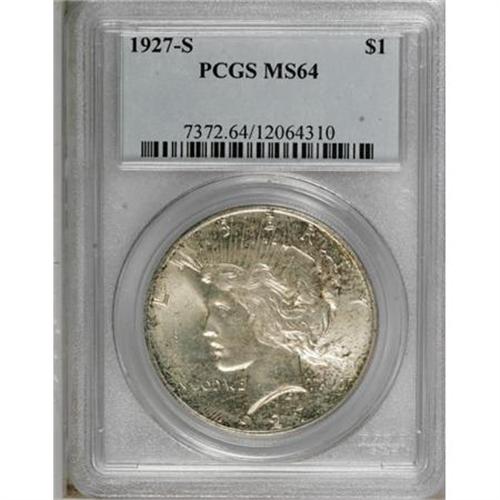 <B>1927-S $1 MS64 PCGS. CAC.</B></I> Intermingled gold and silver-gray patina covers much of this shining Choice dollar, while the obverse margins show dots of deeper toning. Well struck with shallow reed marks on the neck and in the left obverse field.<BR><BR><B>Coin Engraver:</B> Anthony de Francisci<BR><BR><b>Shipping:</b> Coins & Currency (<a target="_blank" href="http://www.heritageauctions.com/common/shipping.php">view shipping information</a>)