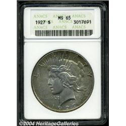 <B>1927<S$1> MS65 ANACS.</B></I> A popular low mintage issue with just 848,000 pieces struck, the present survivor reveals swirling luster effects beneath moderate silver-gray, russet-brown, and charcoal iridescence. A fully brought up and carefully preserved Gem. <BR><BR><B>Important notice:</B> Heritage usually auctions material at the rate of 200-250 lots per hour. On some occasions eBay Live bid software or the Internet may not be able to keep up with the pace of the auction. We recommend placing a realistic absentee bid now as insurance to avoid disappointment. Occasionally the auctioneer may eliminate or reject an eBay Live bid, and the auctioneer may also reopen a lot after the close of the eBay live bidding (usually because we missed an audience bid), and may reject your bid even if it shows you as the winning bidder. By bidding via eBay Live, you agree that Heritage may award the lot to another bidder at its sole discretion under the circumstances described above or any other reasonable circumstances. Since eBay bids are not shown to us until we open the lot on the floor, we treat those bids just like floor bids. In most cases the floor responds before the eBay bid is presented to us, due to Internet lag time, so for consistency we have made it a policy that floor bids are always considered first over tie eBay live bids. Also please note that all Heritage lots purchased through eBay Live carry a 20% Buyer's Premium. Please make sure you read the Terms and Conditions before you bid. </span></font></tr></table></td></tr></table>