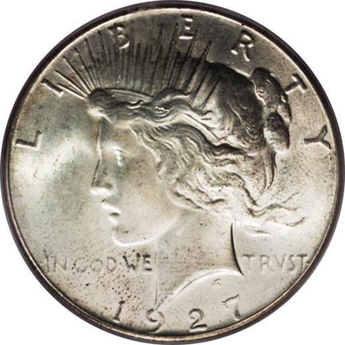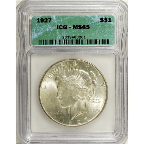 <B>1927 S$1 MS65 ICG.</B></I> This lustrous cream-gray and straw-gold Peace dollar has a good strike and unabraded fields. The portrait is also void of noticeable contact. Minor carbon and a faint fingerprint fragment are of little concern. The 1927 is extremely rare above the MS65 level, and even Gems are elusive.<BR><BR><b>Shipping:</b> Coins & Currency (<a target="_blank" href="http://www.heritageauctions.com/common/shipping.php">view shipping information</a>)
