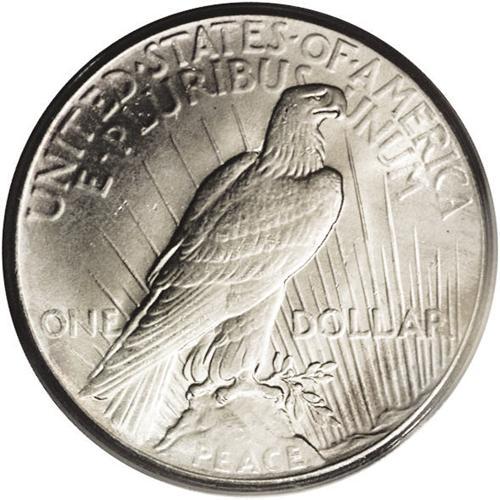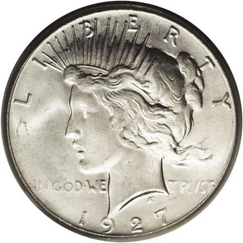 <B>1927<img border='0' src='http://www.heritagecoins.com/images/star.gif' width=10 height=10>$1> MS65 PCGS.</B></I> A well struck Gem, this coin displays impressive cartwheel luster. A faint amount of natural milky patina rests on both obverse and reverse. There are only a few contact marks and milling marks scattered throughout, and these hardly detract. An attractive example of this popular, low mintage date.