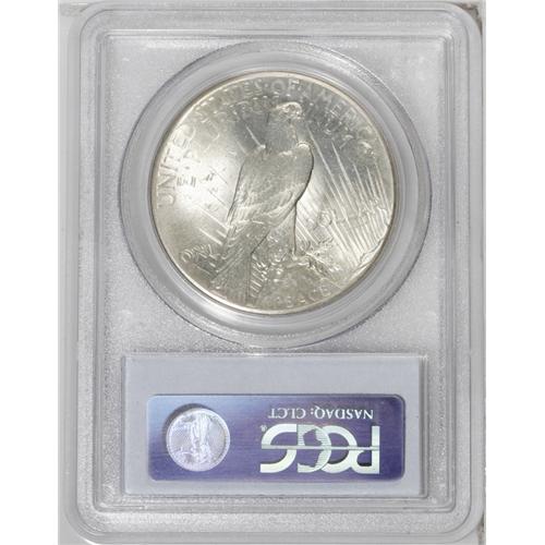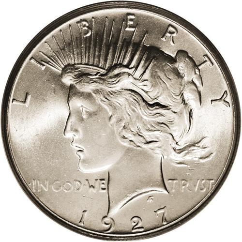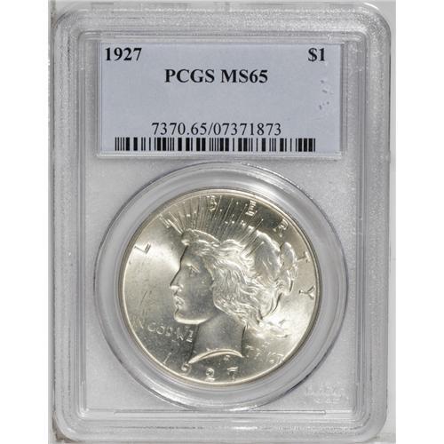 <B>1927<img border='0' src='http://www.heritagecoins.com/images/star.gif' width=10 height=10>$1> MS65 PCGS.</B></I> An unusually sharp strike seems to separate this Gem from the run-of-the-mill example. A brilliant, essentially untoned appearance shows overall and the carefully preserved surfaces only show a few minor blemishes. A very attractive, high grade example of this popular and scarce semi-key date.