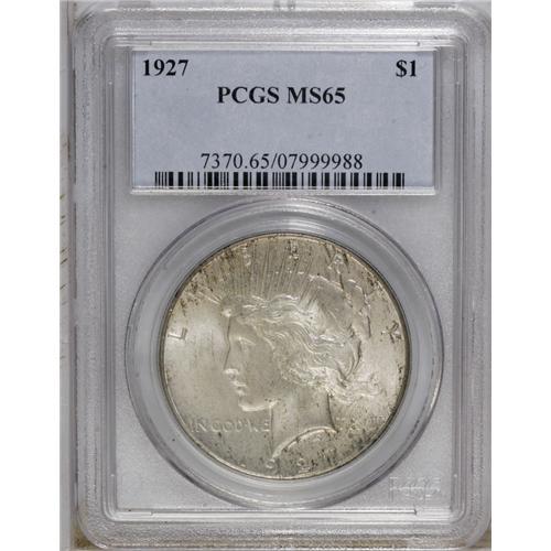 <B>1927 S$1 MS65 PCGS.</B></I> Glimpses of chestnut and russet overlie this lovely cream-gray Gem. This satiny and smooth low mintage silver dollar is suitably struck, although the centers display a few trivial marks that existed on the planchet before the strike. PCGS has certified just five pieces finer (10/06).<BR><BR><b>Shipping:</b> Coin/Currency (<a target="_blank" href="http://www.heritageauctions.com/common/shipping.php">view shipping information</a>)