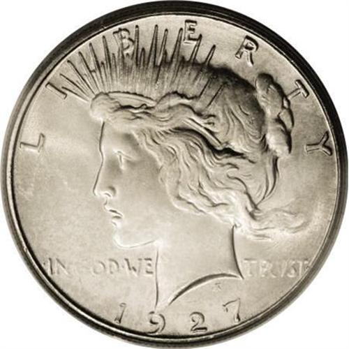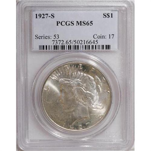 <B>1927-S $1 MS65 PCGS.</B></I> The 1927-S Peace Dollar is, along with the 1925-S and 1928-S, the key to this popular series in Gem grades. A look at the population figures immediately gives some insight into why, as the major grading services combined have certified only 124 1927-S dollars in MS65, with only three finer (7/07). A look at the present coin only confirms its Gem status, as its bright satiny luster combines with a light wash of gold-olive luster to present a pleasing appearance. A few small surface marks can be seen, with one on Liberty's hair over the ear seemingly the only thing preventing an even higher grade.<I><BR>From The Arnold & Harriet Collection.</B></I><BR><BR><B>Coin Engraver:</B> Anthony de Francisci<BR><BR><b>Shipping:</b> Coins & Currency (<a target="_blank" href="http://www.heritageauctions.com/common/shipping.php">view shipping information</a>\)