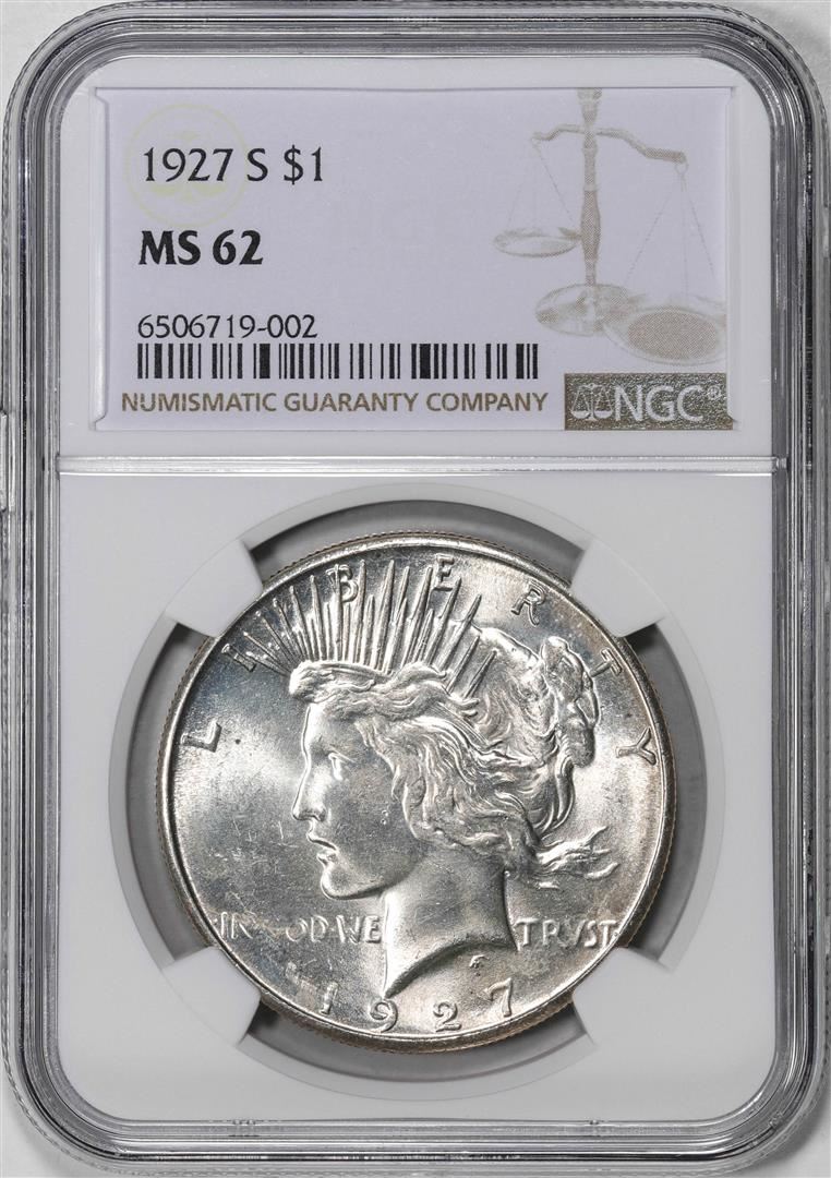 One 1927-S $1 Peace Silver Dollar Coin NGC MS62. NGC Certified.
