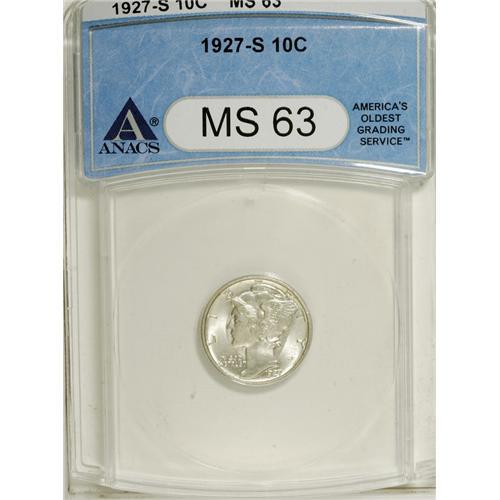 <B>1927-S 10C MS63 ANACS.</B></I> NGC Census: (18/69). PCGS Population (34/66). Mintage: 4,770,000. Numismedia Wsl. Price: $458. (#4964)<BR><BR><b>Shipping:</b> Coins & Currency (<a target="_blank" href="http://www.heritageauctions.com/common/shipping.php">view shipping information</a>)