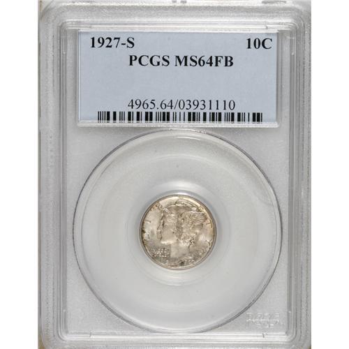 <B>1927-S 10C MS64 Full Bands PCGS.</B></I> Delicate salmon-pink and ice-blue shades grace this thoroughly lustrous and assertively struck near-Gem. A solitary tiny mark on the cheek limits the grade. Population: 41 in 64, 40 finer (2/07).<BR><BR><b>Shipping:</b> Coins & Currency (<a target="_blank" href="http://www.heritageauctions.com/common/shipping.php">view shipping information</a>)