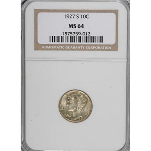 <B>1927-S 10C MS64 NGC.</B></I> NGC Census: (35/35). PCGS Population (43/24). Mintage: 4,770,000. Numismedia Wsl. Price for NGC/PCGS coin in MS64: $565. (#4964)<BR><BR><B>Coin Engraver:</B> Adolph A. Weinman<BR><BR><b>Shipping:</b> Coins & Currency (<a target="_blank" href="http://www.heritageauctions.com/common/shipping.php">view shipping information</a>)