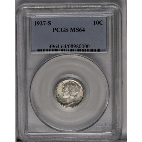 <B>1927-S<10C> MS64 PCGS.</B></I> Sharply struck and tantalizingly close to having fully split central reverse bands. An opaque coating of ivory-gray toning covers each side of the piece. Free of contact marks or luster breaks. A pleasing near-Gem example of this San Francisco issue. Population: 46 in 64, 23 finer (6/06).