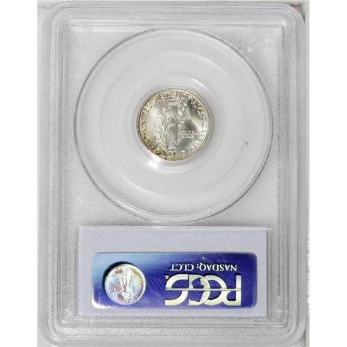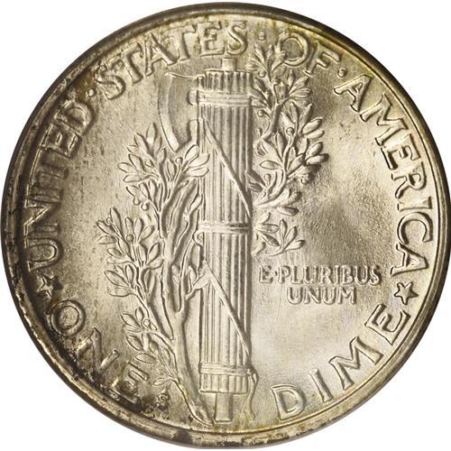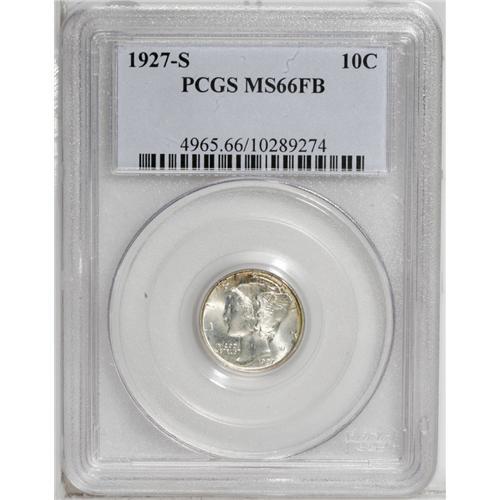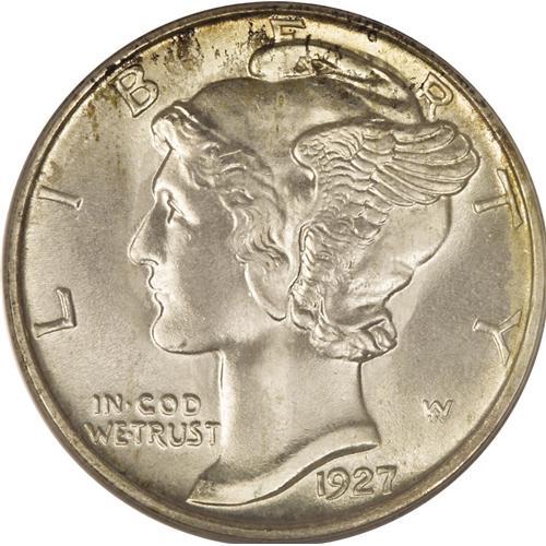 <B>1927-S<10C> MS66 Full Bands PCGS.</B></I> A soft golden cast radiates from each side of this attractive, well produced Premium Gem, with tinges of smoke-gray toning added. The 1927-S is generally better produced than the 1924-S and 1925-S issues, except it is more elusive to find with full bands. This specimen offers completely split bands, however, and a good strike overall. A couple of small ticks are noted on the lower diagonal band. On the obverse, some brilliant patches from excessive die burnishing around the Liberty figure, a phenomenon Lange calls "die burn," are noted. This lovely piece is among the finest Full Bands pieces at either service. Population: 11 in 66 Full Bands, 0 finer (7/06).
